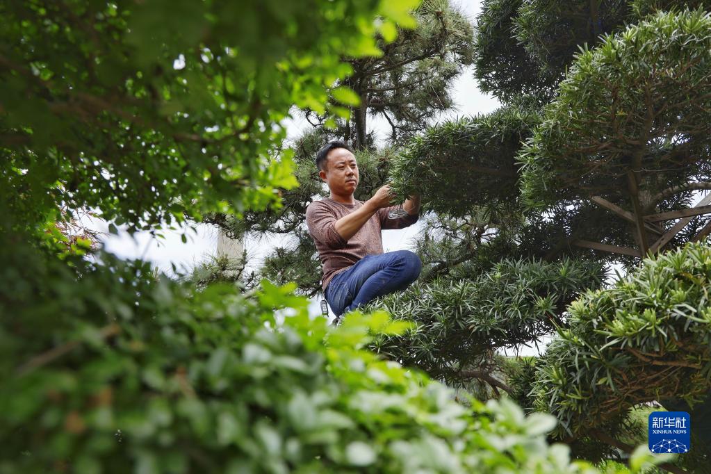5月7日,花木维护人员在江苏省扬州市江都区朴园内修剪枝叶。