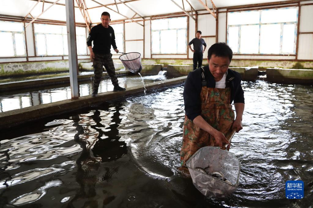 5月7日,养殖基地负责人耿海涛(前)在育苗区打捞细鳞鲑鱼苗。