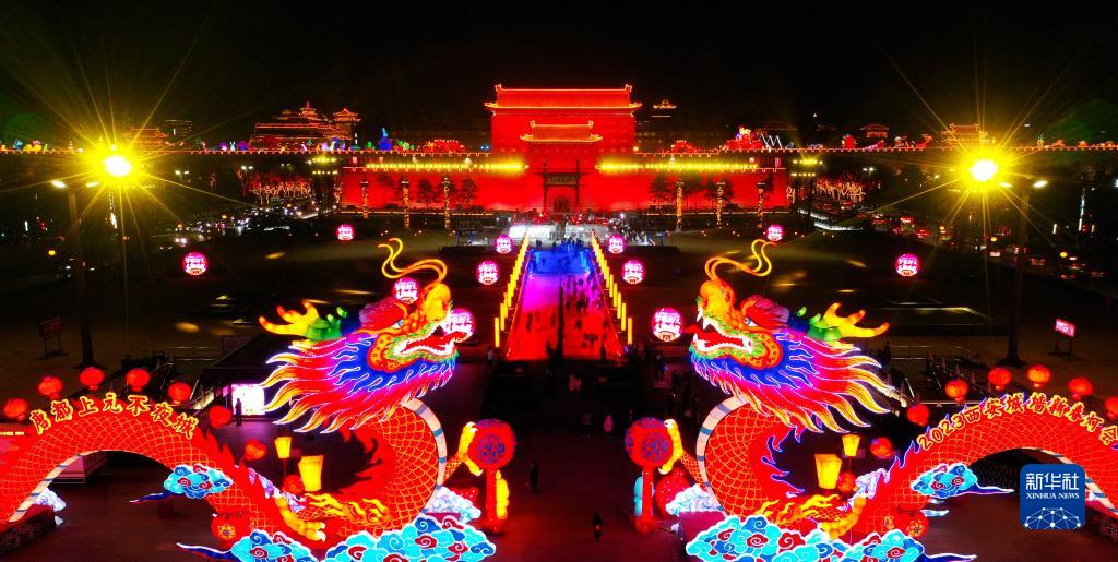 2023年春节期间西安城墙永宁门的花灯(1月26日摄,无人机照片)。