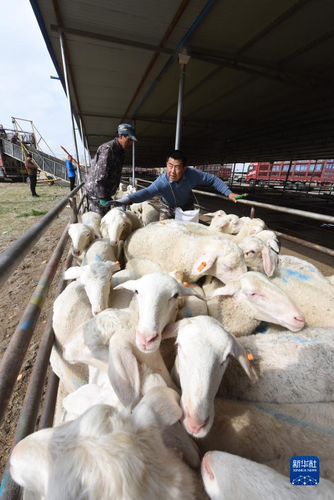 5月7日,在古浪森茂牛羊交易市场,工作人员将活羊装车。