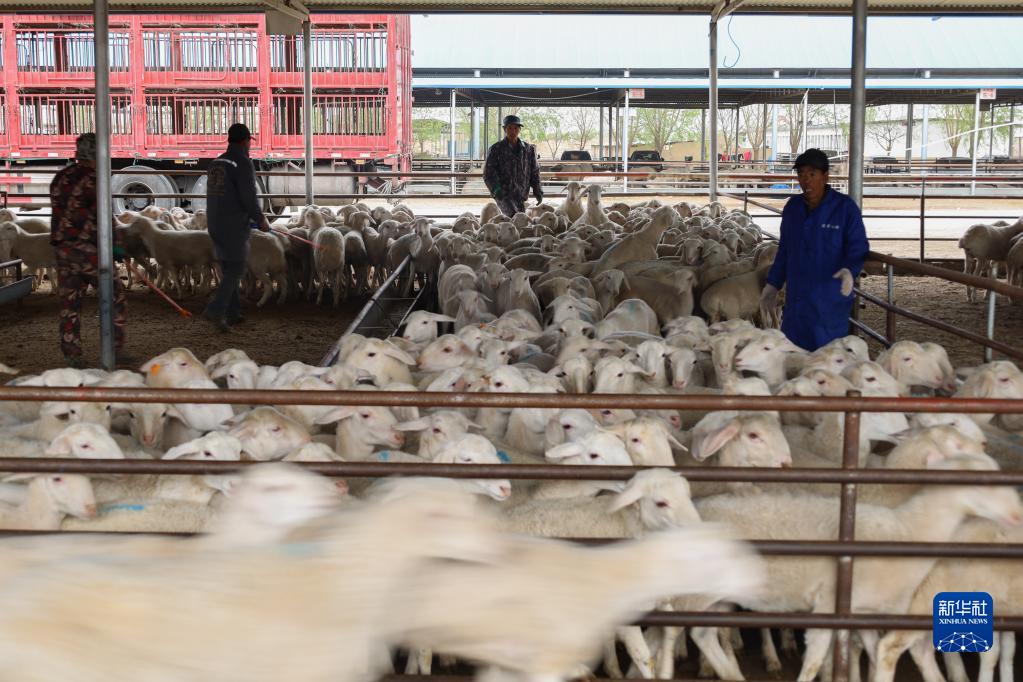 5月7日,在古浪森茂牛羊交易市场,工作人员赶羊装车。