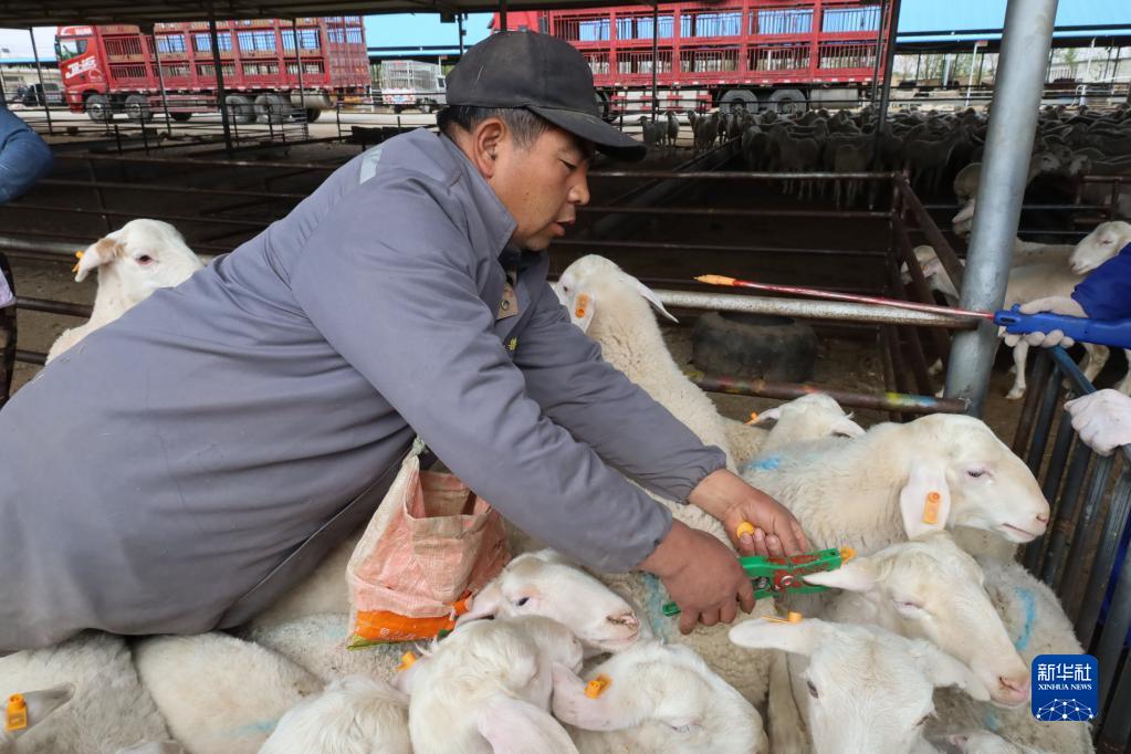 5月7日,在古浪森茂牛羊交易市场,工作人员给羊打耳标。