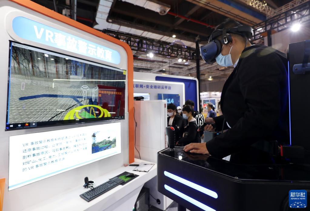 5月8日,参观者在展会上体验一款VR事故警示教育系统。