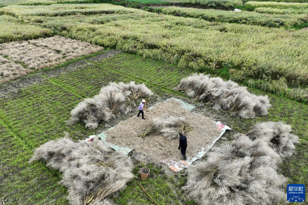 5月8日,重庆市黔江区中塘镇胜利村村民在进行油菜脱籽(无人机照片)。