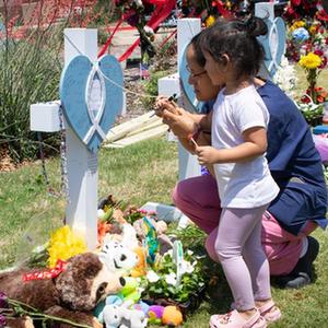 5月8日,在美国得克萨斯州达拉斯以北城镇艾伦,人们在购物中心枪击事件现场附近悼念受害者。