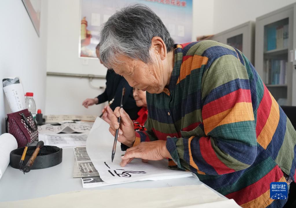 5月9日,老人在北京市平谷区西樊各庄村“养老驿站”练习书法。