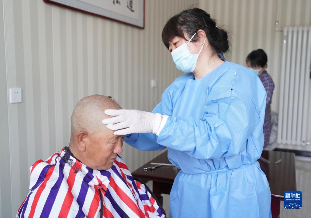 5月9日,在北京市平谷区西樊各庄村“养老驿站”,工作人员为老人理发。