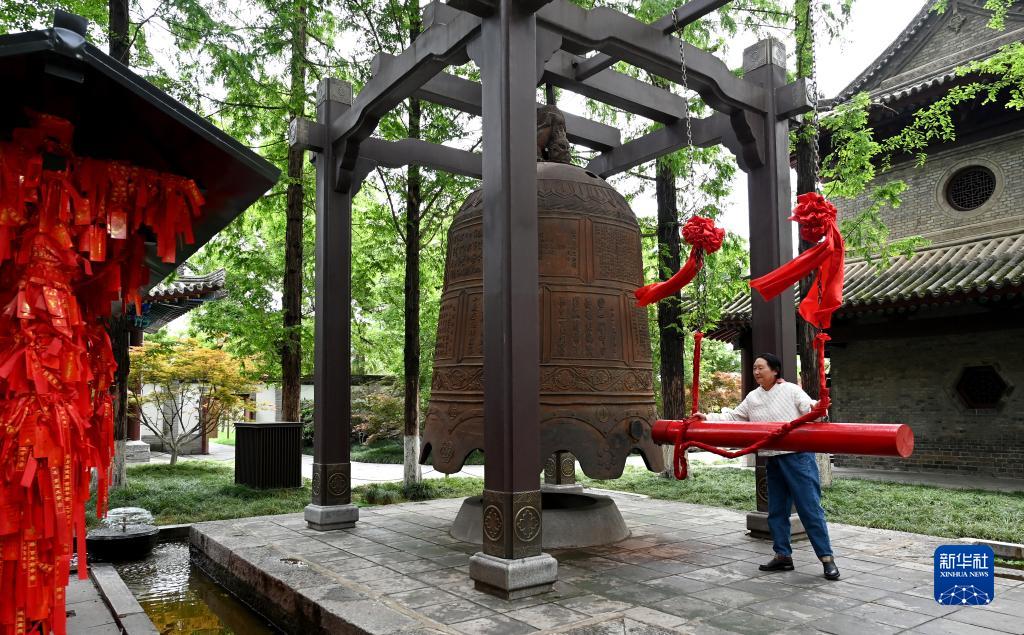 游客在西安荐福寺内敲钟祈福(5月8日摄)。荐福寺钟楼内的古钟与小雁塔曾一起形成了“关中八景”之一的“雁塔晨钟”。