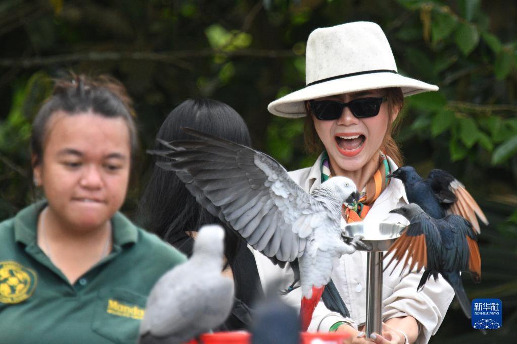 5月8日,观众在新加坡飞禽公园开放当天来到园内喂鸟。