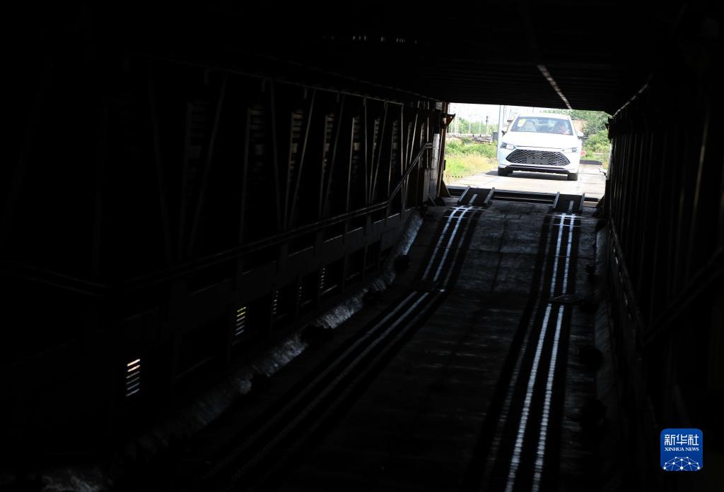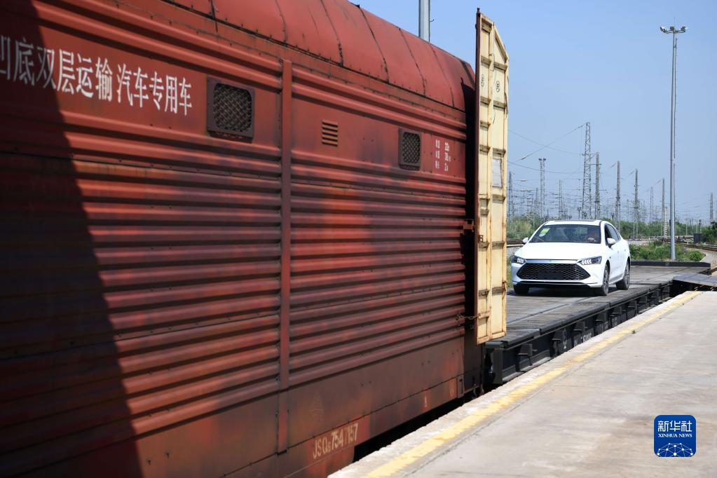 5月9日,在铁路水家湖货运站,工作人员装运新能源汽车。