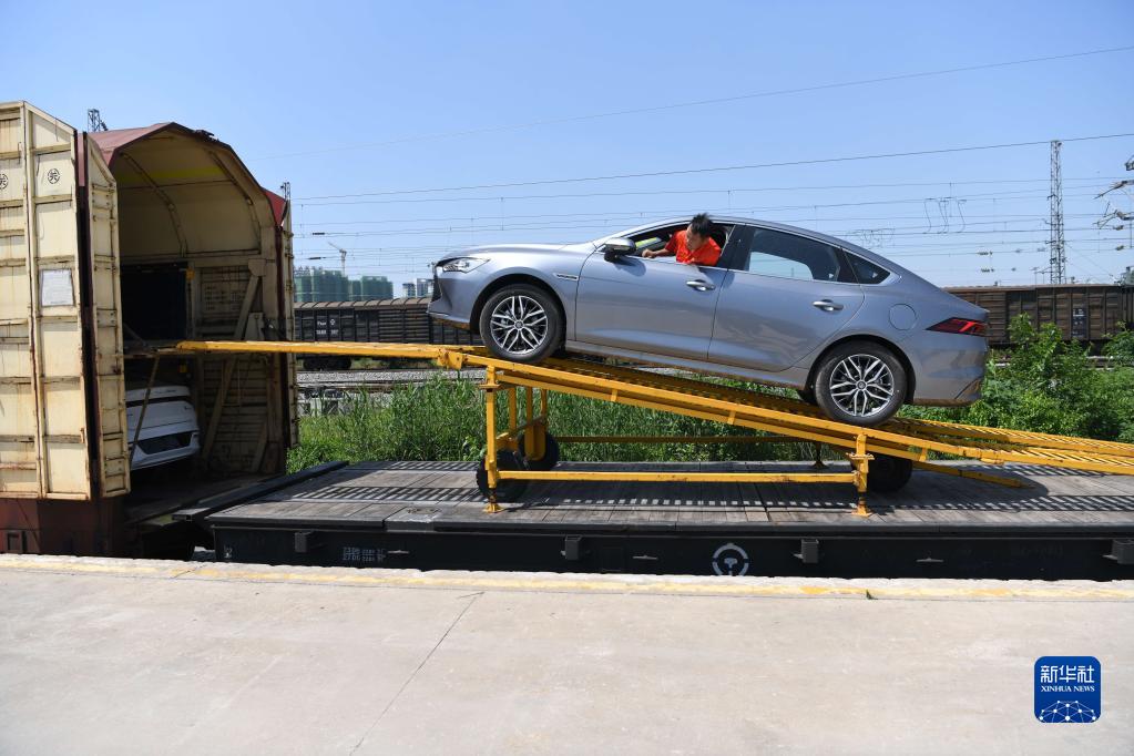5月9日,在铁路水家湖货运站,工作人员装运新能源汽车。