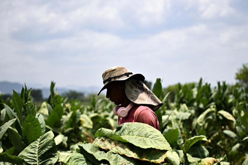 5月8日,在洪都拉斯南部城市丹利的一家雪茄烟叶种植园,工人采摘烟叶。