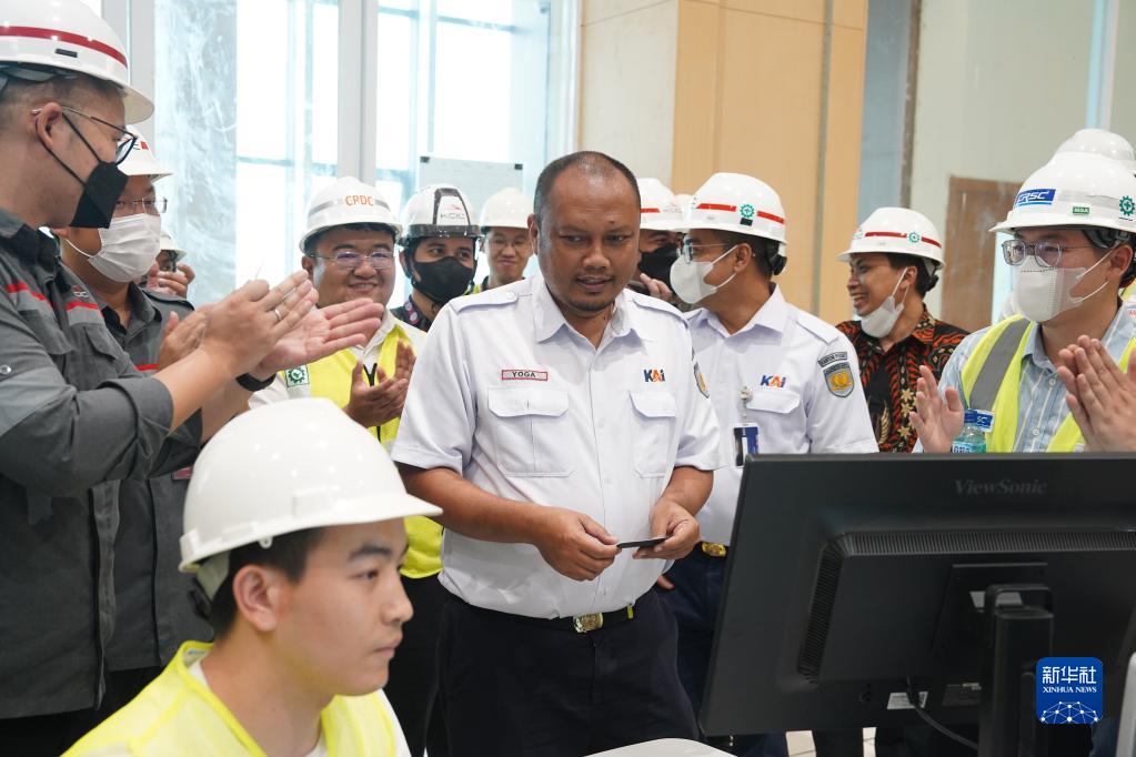 5月8日,在印度尼西亚万隆雅万高铁调度大厅,印尼中国高速铁路有限公司和印尼铁路公司工作人员一同见证雅万高铁首张客票样票打印。