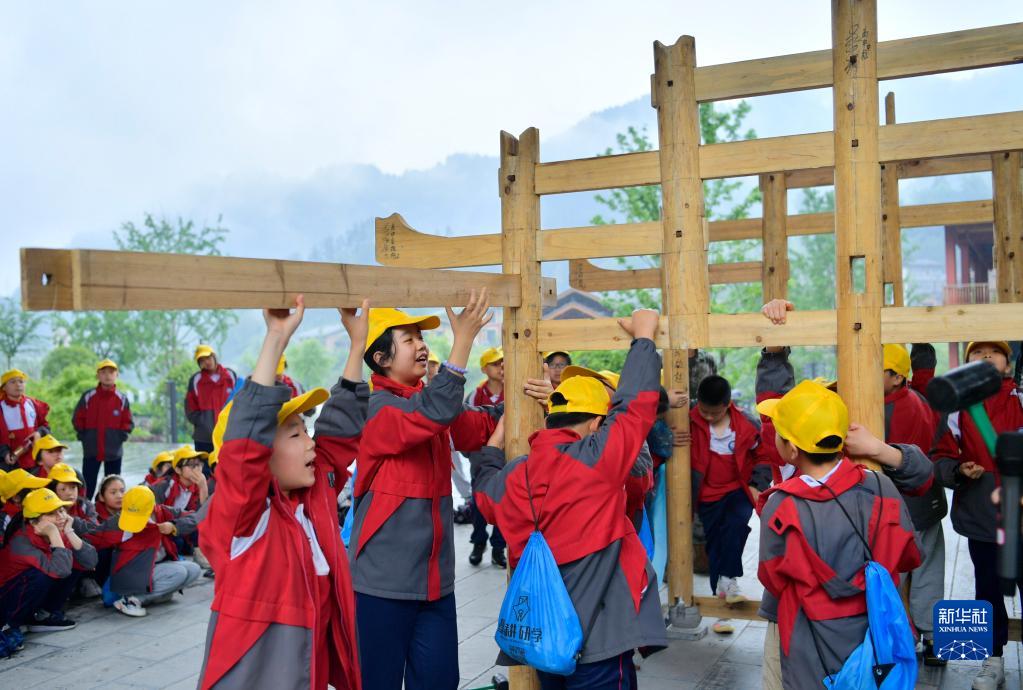 5月9日,宣恩县第三民族实验小学的学生在彭家寨参与“营造吊脚楼”体验活动。