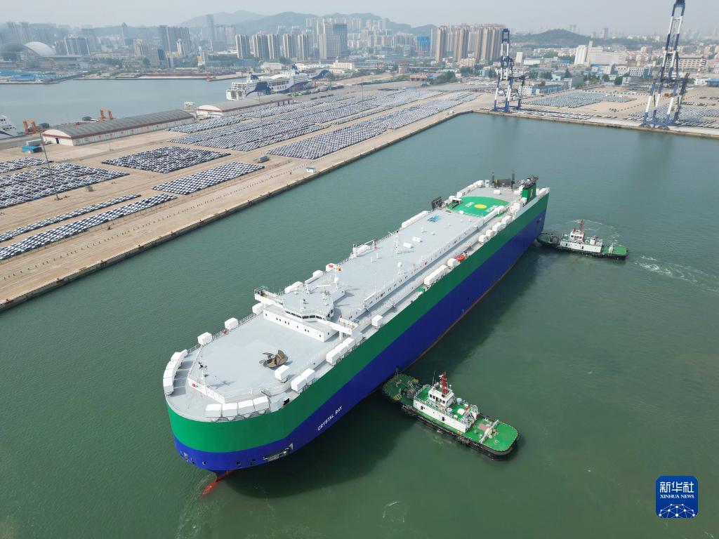 5月9日,一艘汽车滚装船靠泊山东港口烟台港装载出口商品车(无人机照片)。