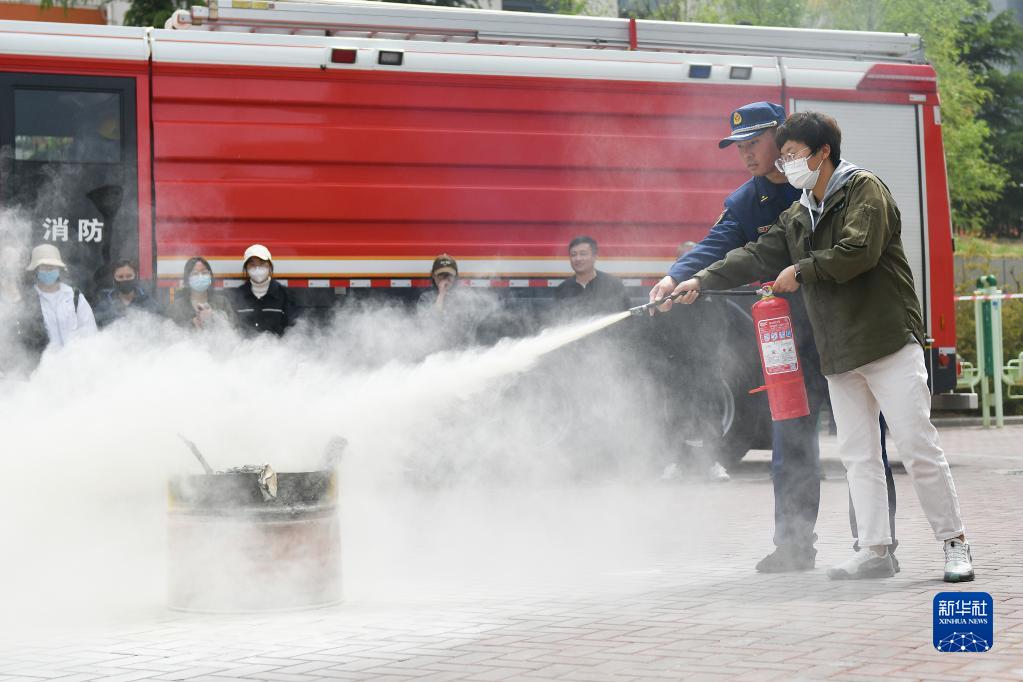 5月9日,在山东省烟台经济技术开发区大季家街道瑞祥社区,消防员指导社区工作人员使用灭火器。