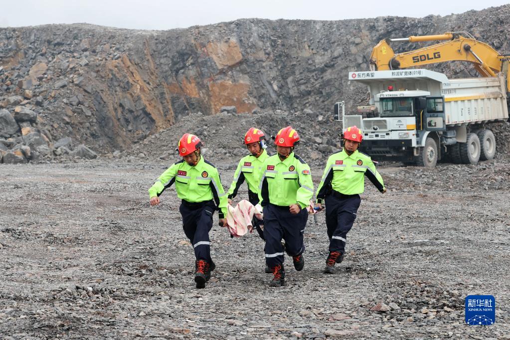 5月9日,在重庆市黔江区一露天非煤矿山演练现场,救援队员转移“被困人员”。