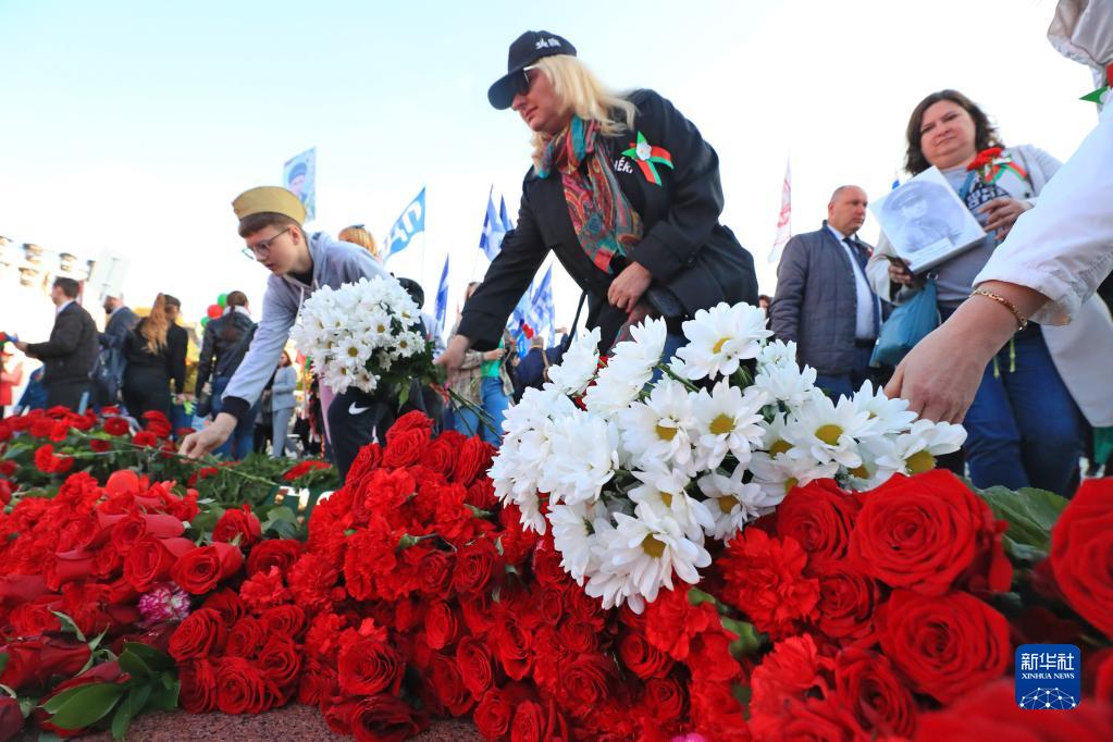 5月9日,白俄罗斯民众在明斯克的胜利广场向胜利纪念碑献花。