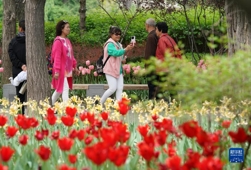 近日,山西省太原市迎泽公园内各色郁金香竞相绽放,吸引游人前来观花赏景。
