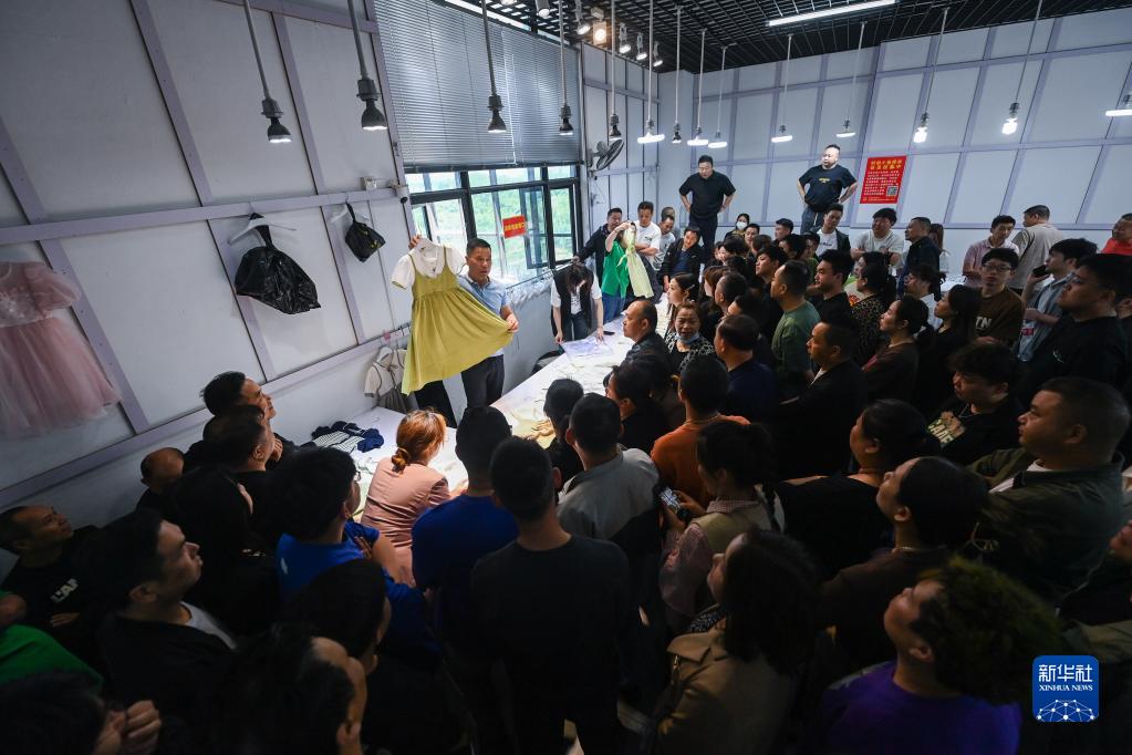 5月10日,在位于湖州吴兴区织里镇的织里国际轻纺城内,商家在进行新款样衣的展示。