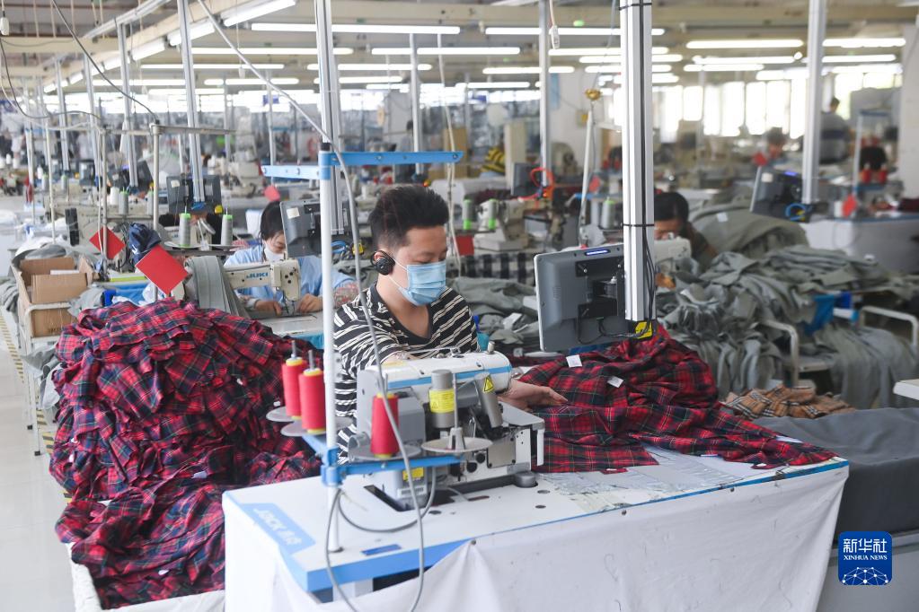 5月10日,在位于湖州市吴兴区织里镇的弗兰尼尔(湖州)服饰有限公司生产车间内,工人在流水线上生产童装。
