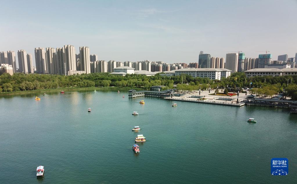 位于淄博市张店区的齐盛湖(5月8日摄,无人机照片)。