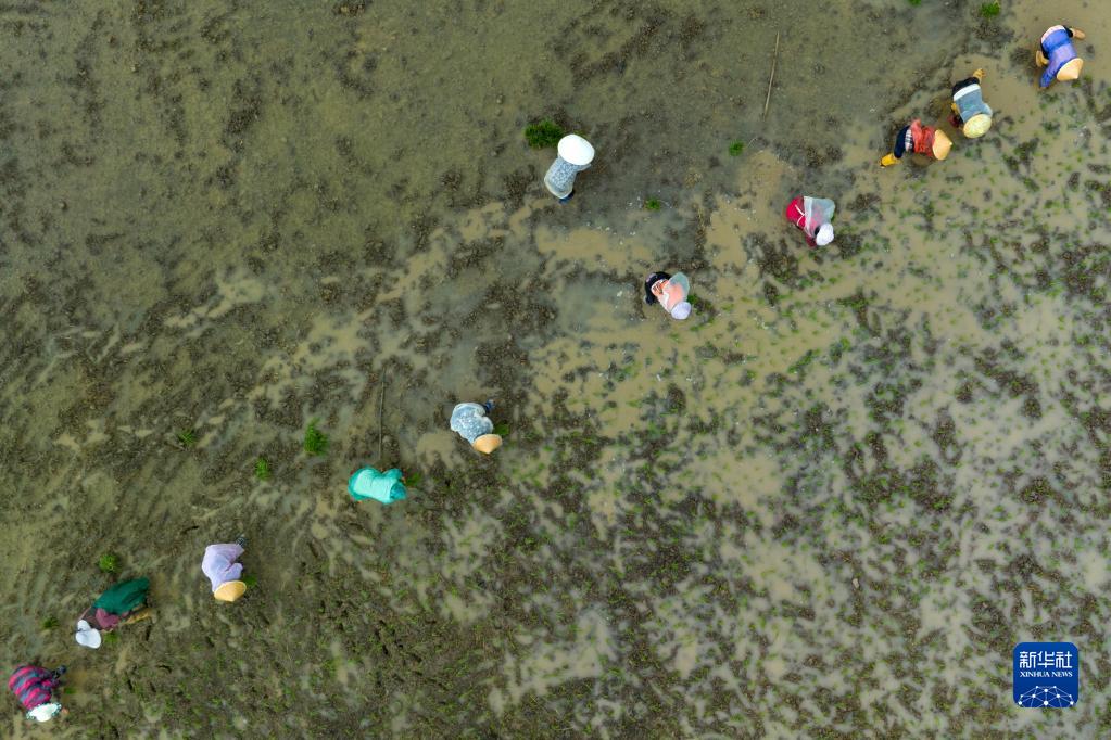 5月9日,在四川省崇州市道明镇协和社区,农民在一片高标准农田里种植水稻(无人机照片)。