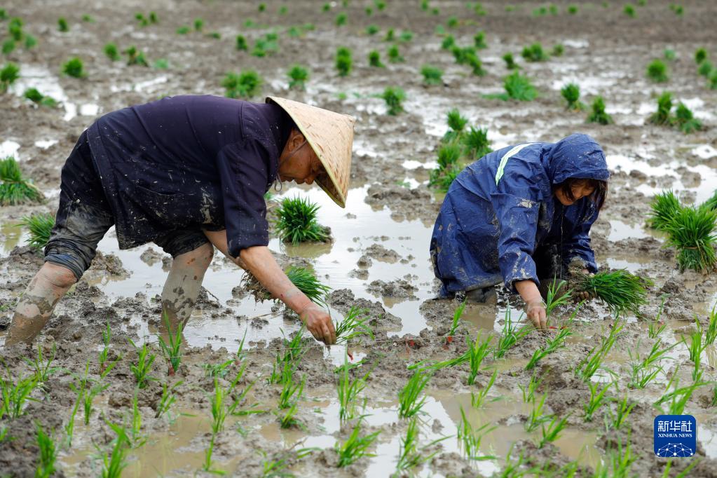 5月9日,在四川省崇州市道明镇协和社区,农民在一片高标准农田里种植水稻。