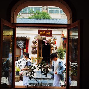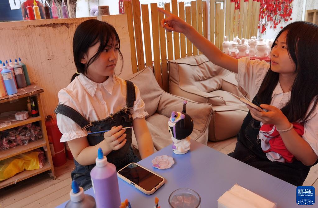 5月10日,两名年轻人在山东济宁环西北里文创街区体验手工项目。
