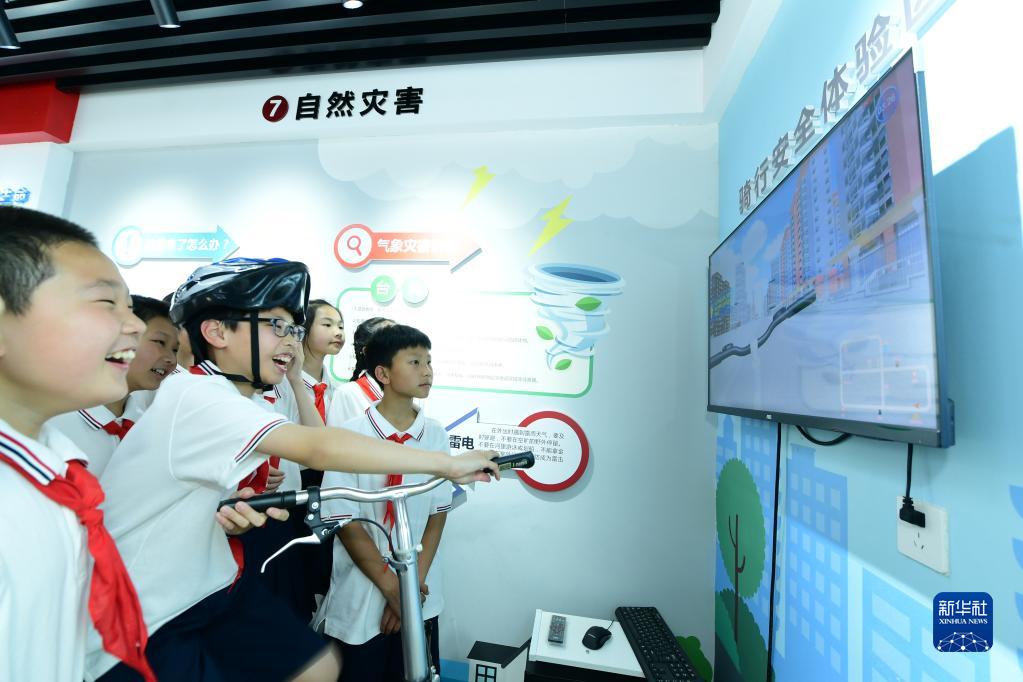 5月10日,江苏省太仓市沙溪镇直塘小学的学生在生命健康安全体验教室体验安全骑行。