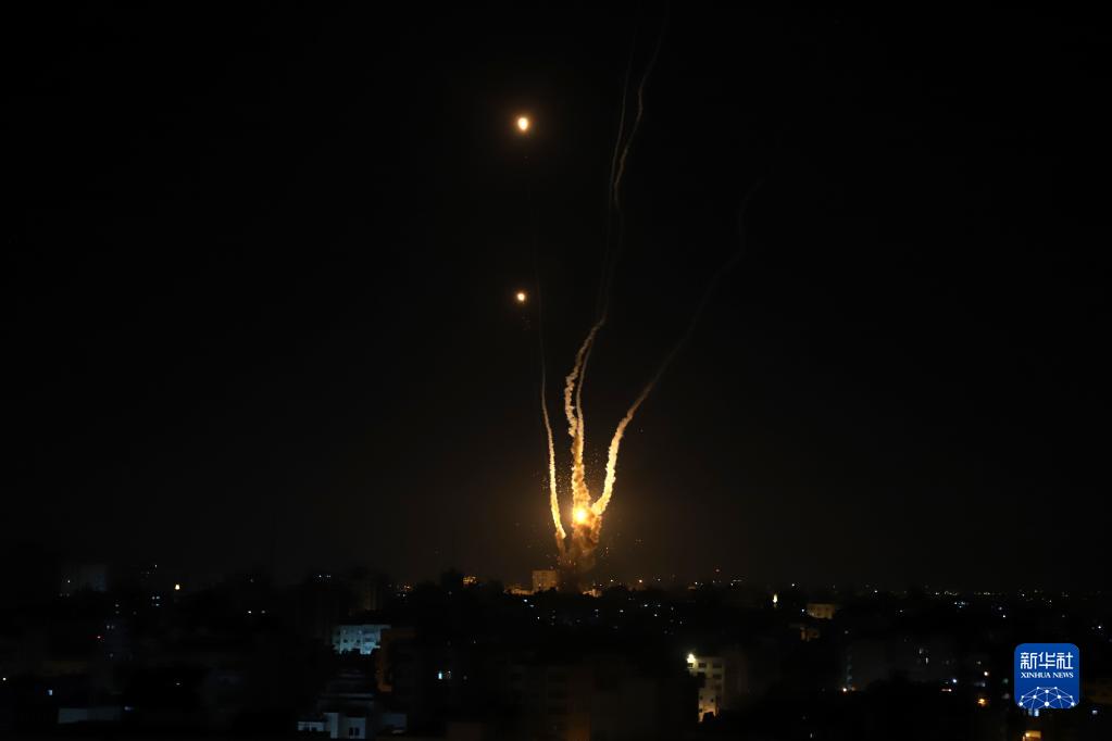 这是5月10日在加沙城拍摄的从加沙地带射向以色列的火箭弹。