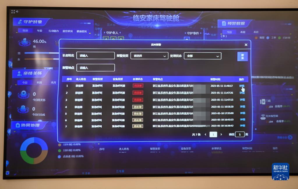 这是杭州市临安区智慧养老服务中心的数字监管平台上的临安区各地家庭养老床位显示的紧急呼叫情况,将会第一时间通知家属或者助老员上门查看(5月11日摄)。