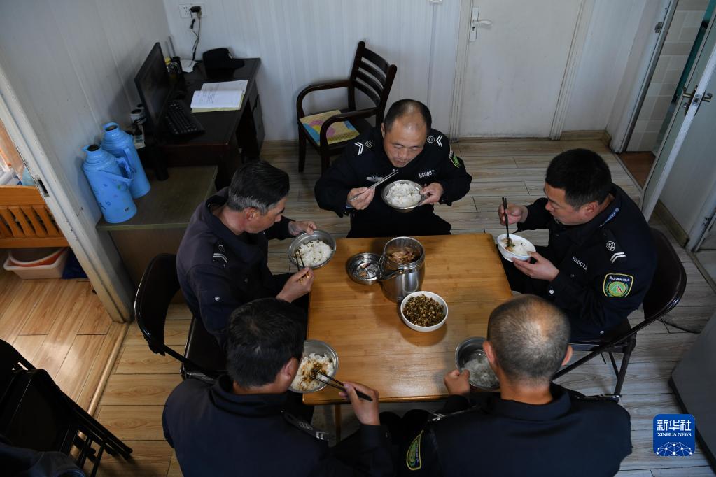 4月20日,在黄山风景区平天矼瞭望哨内,瞭望哨防火小队5名队员在吃晚饭,右一为秦志平。