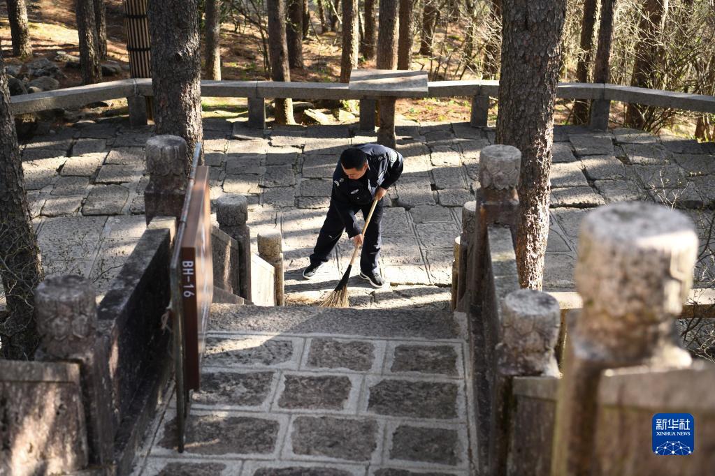 4月21日,在黄山风景区平天矼瞭望哨门口,秦志平在打扫山道。
