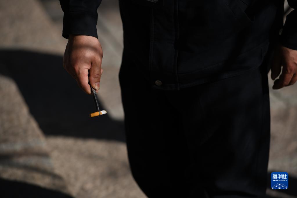 4月21日,秦志平在黄山风景区进行路段巡查时将地面的烟头放进指定位置。