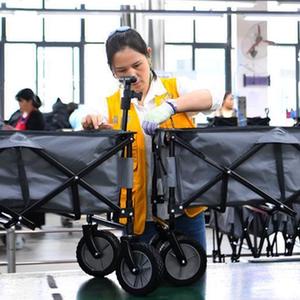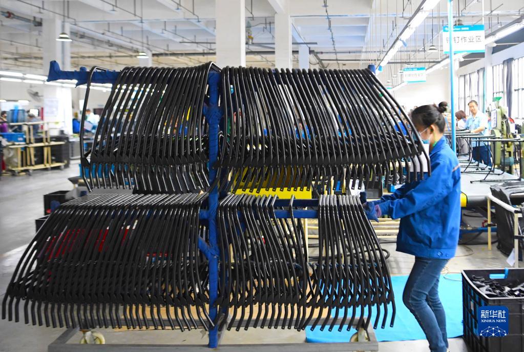 5月10日,工作人员在河南省驻马店市平舆县一家户外用品企业安装车间忙碌。