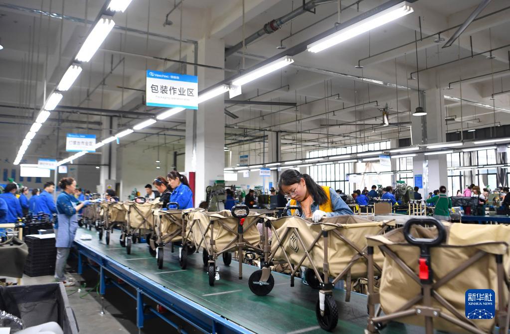 5月10日,工作人员在河南省驻马店市平舆县一家户外用品企业安装车间忙碌。