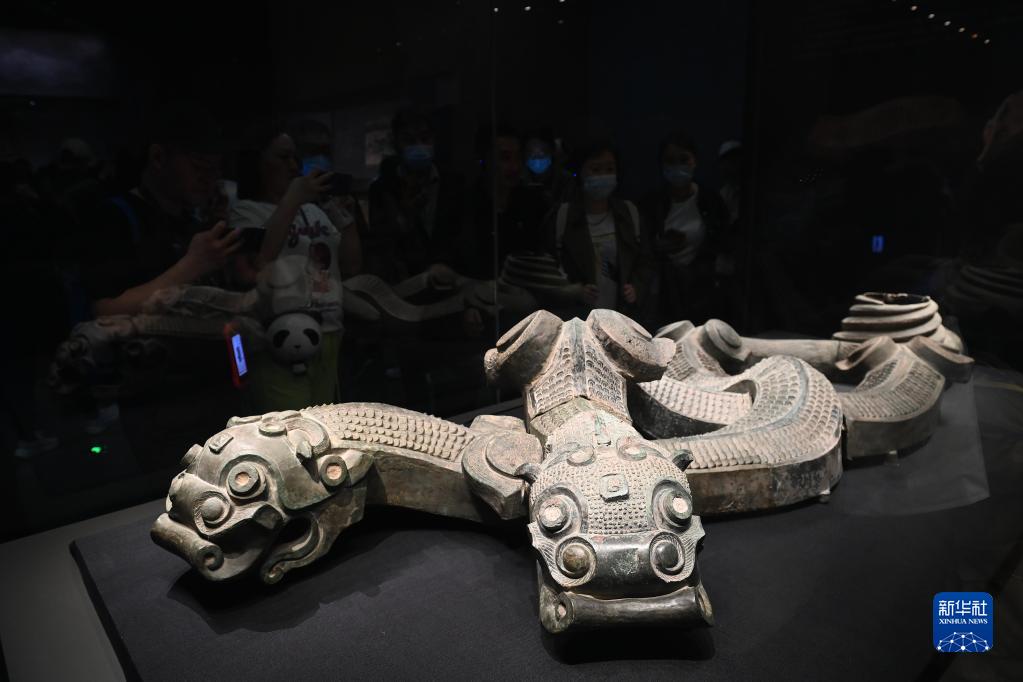 5月11日,游客在陕西历史博物馆参观馆藏战国文物青铜龙。