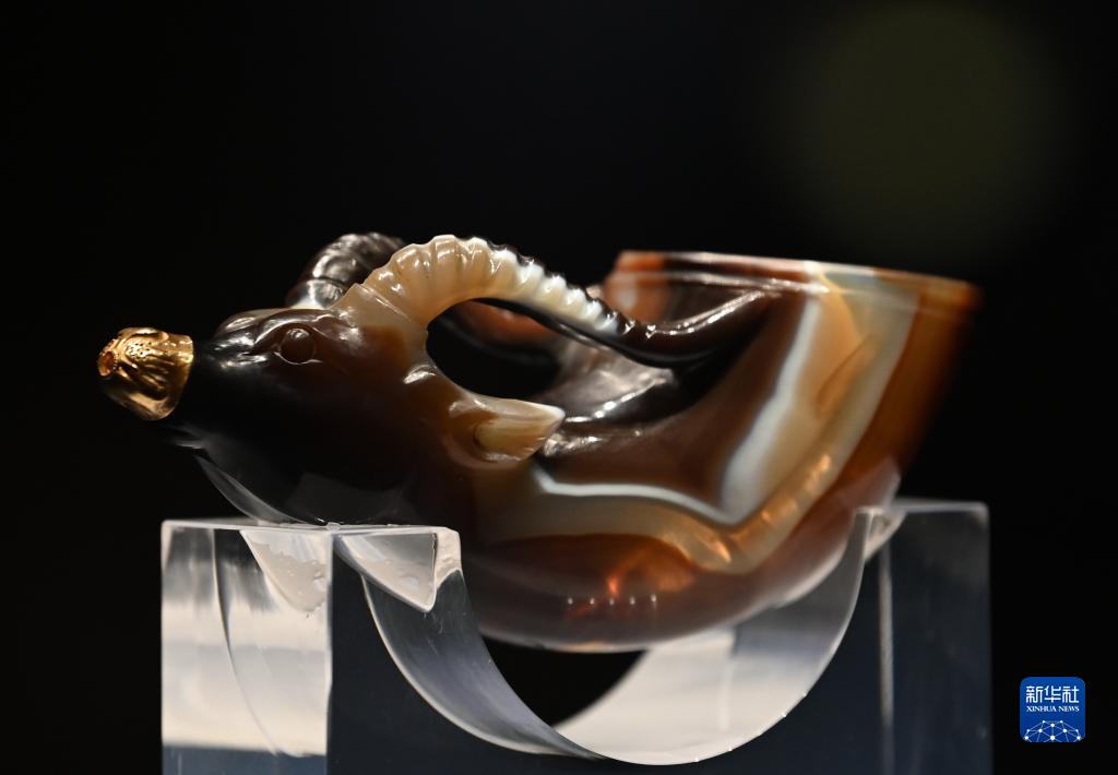5月11日在陕西历史博物馆拍摄的馆藏唐代文物镶金兽首玛瑙杯。