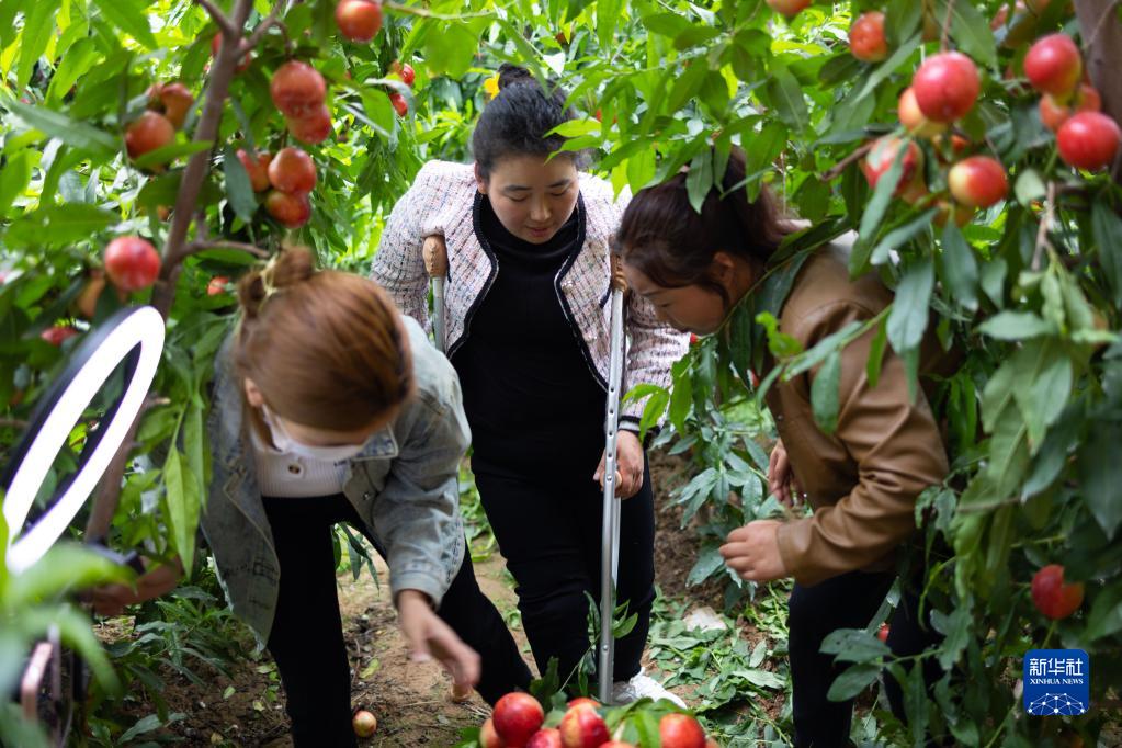 5月10日,在陕西渭南市大荔县埝桥镇北黄村油桃大棚,马宁(中)在网上做直播带货后与同事收拾油桃。