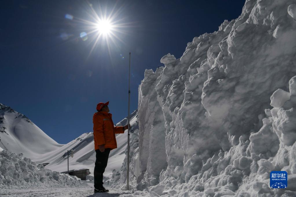 乌兰萨德克养护站工人宋雪岭在海拔约3400米的哈希勒根隧道附近测量积雪深度(5月10日摄)。