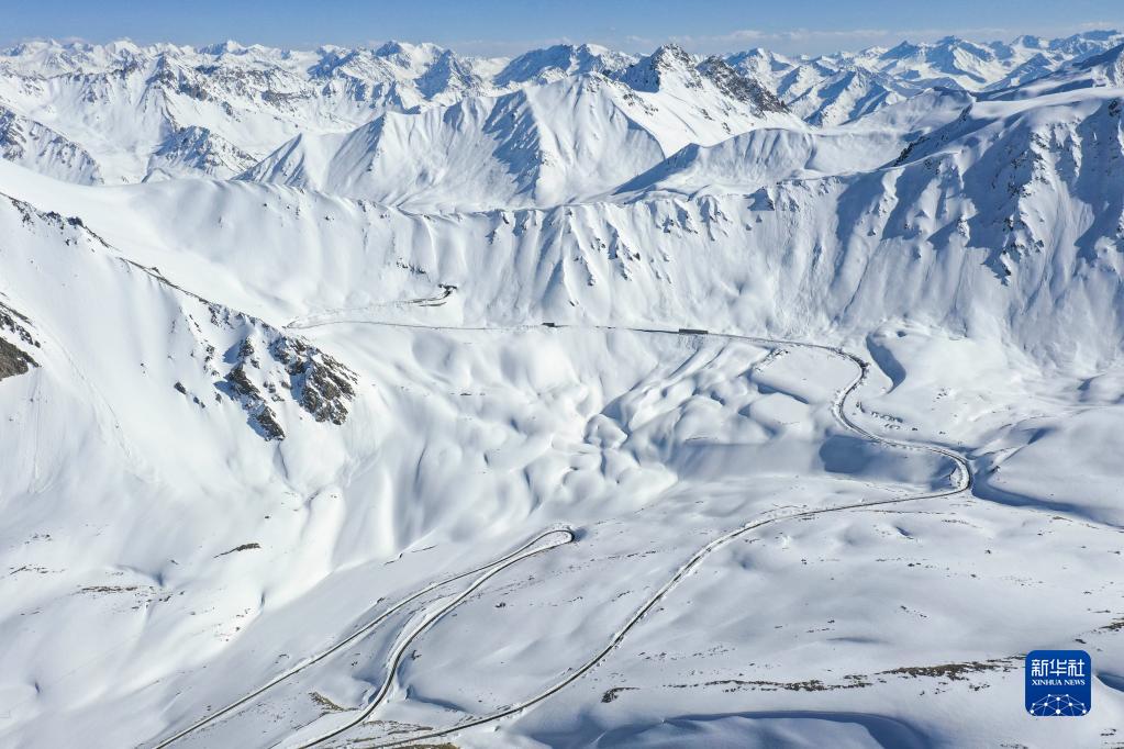 独库公路向天山深处延伸,由乌兰萨德克养护站工人耗时多日清理出的路面已清晰可见(5月10日摄,无人机照片)。