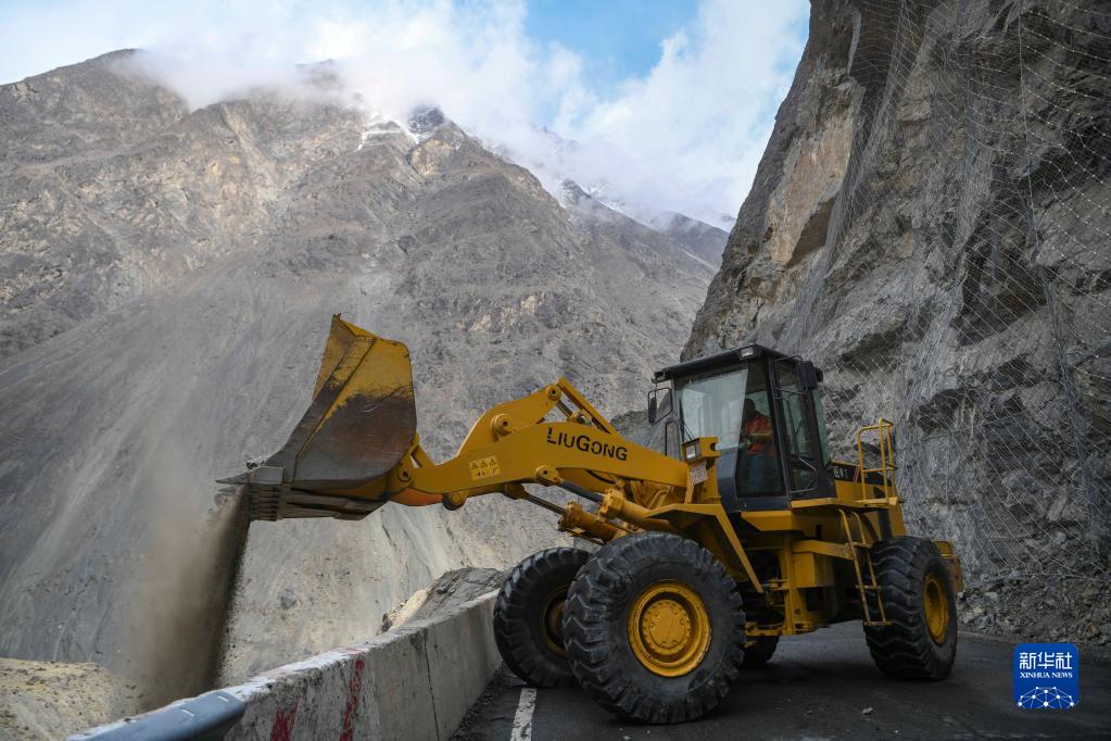 乌兰萨德克养护站的工人驾驶装载机在独库公路上清理碎落的山石(5月8日摄)。