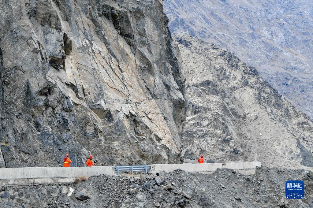 乌兰萨德克养护站的工人在独库公路上清理碎落的山石(5月8日摄)。