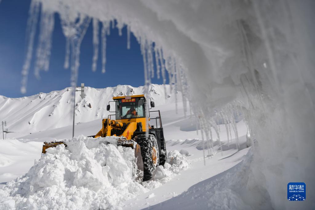 乌兰萨德克养护站工人乌斯曼·巴克驾驶装载机在独库公路的雪崩多发路段上清雪(5月9日摄)。