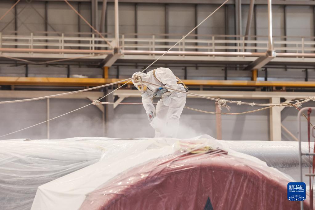 5月11日,喷涂作业员对空客A350-900宽体客机进行油漆喷涂。
