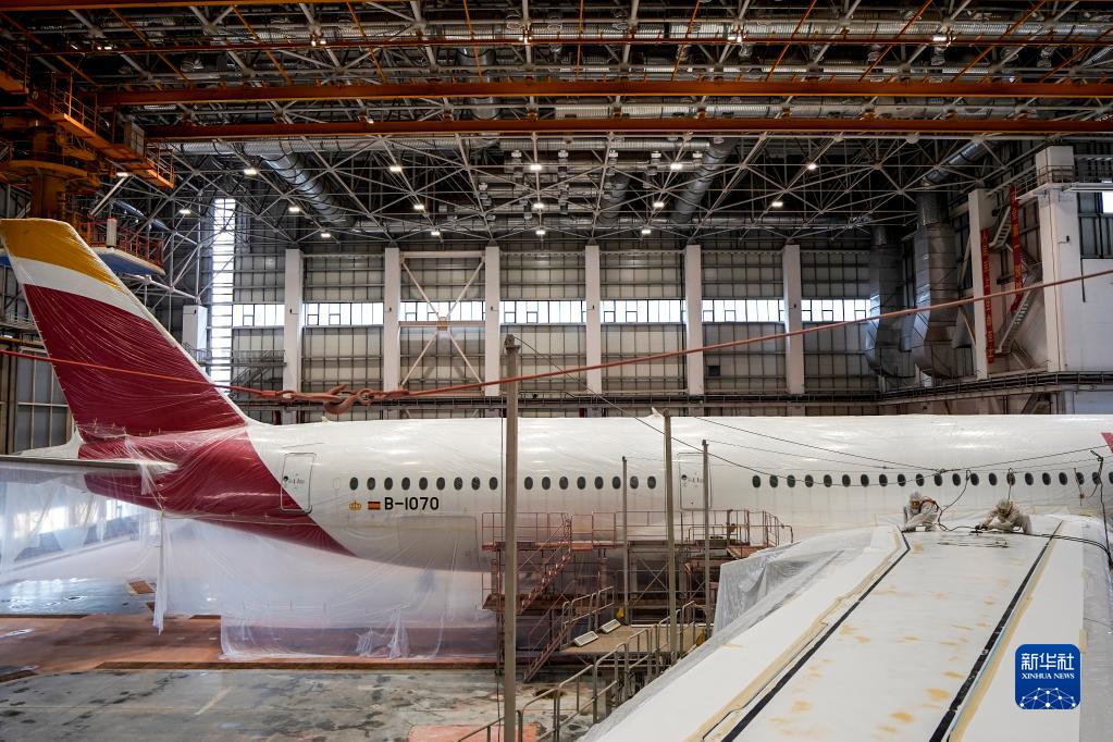 5月11日,喷涂作业员对空客A350-900宽体客机进行打磨除漆。