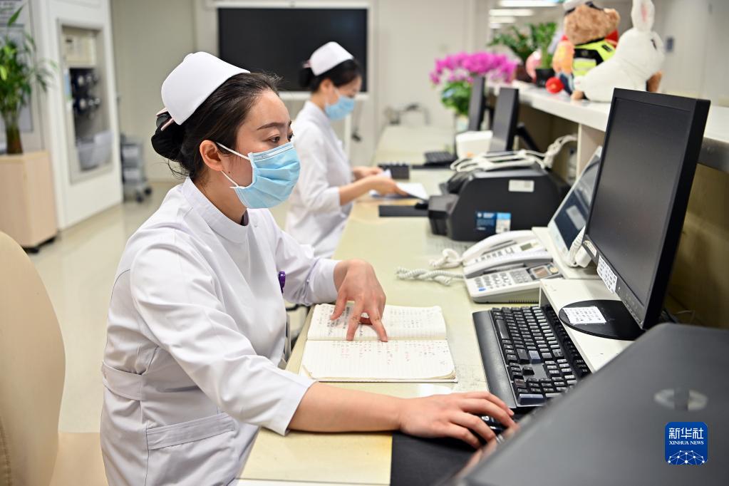 5月11日6时许,北京协和医院基本外科四病房护士李婷(前)在书写护理记录并录入电脑;李美宣在检查护理记录并盖签名章。