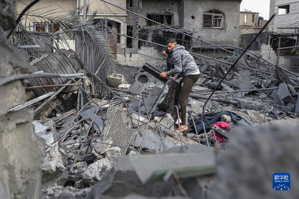 5月11日,在加沙地带拜特拉希亚,一名男子检查空袭后的自家房屋废墟。