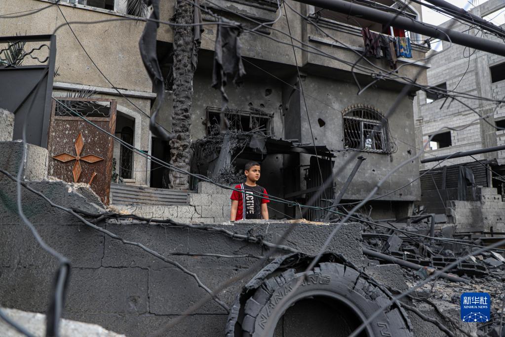 5月11日,在加沙地带拜特拉希亚,一个男孩站在空袭后的自家房屋废墟中。